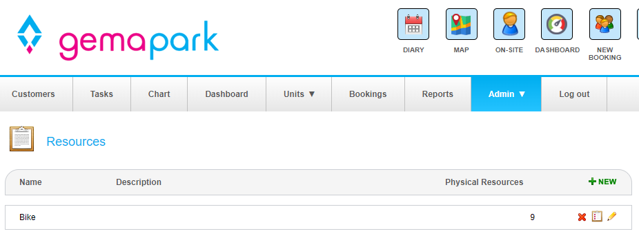 Resources are defined at company level and can be shared across parks. They can be accessed from the admin dropdown in the top menu bar, Admin > Resources.