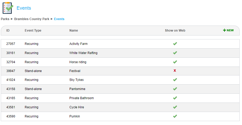 Resources are defined at park level. They can be accessed from the admin dropdown in the top menu bar, Admin > ‘Park Name’, then click events from the right-hand menu.