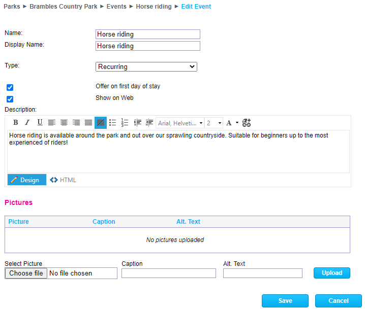 On the new event screen you can set up the event details with a description that shows on the website and a picture if you would like one.