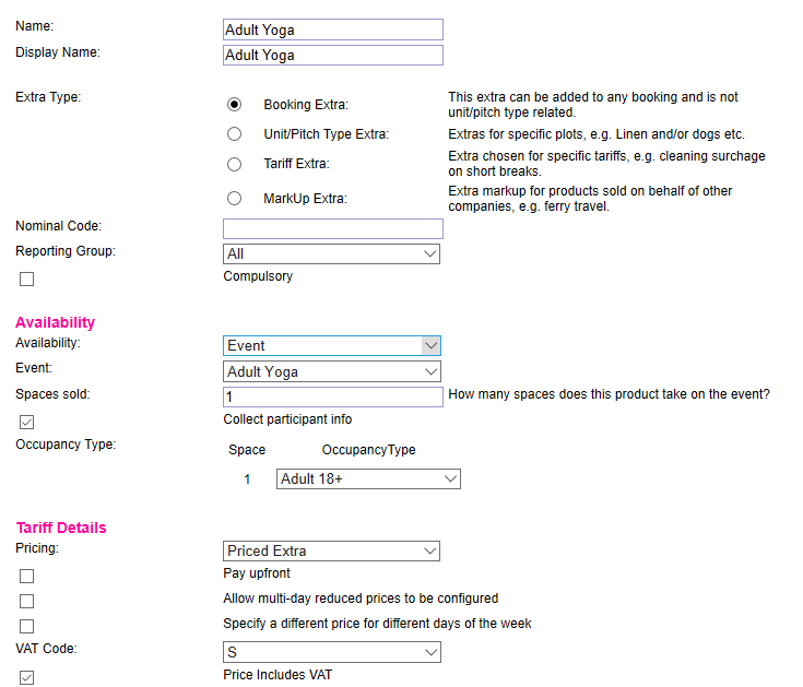 Once the extra has been set up you will then price the extra in the normal way with the price being per spot on the event.