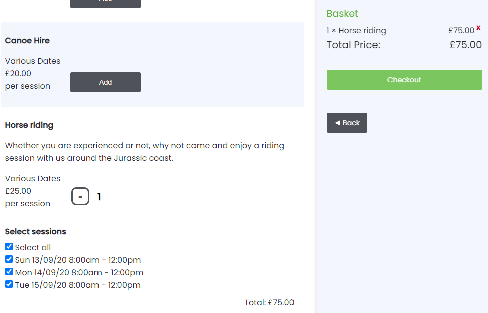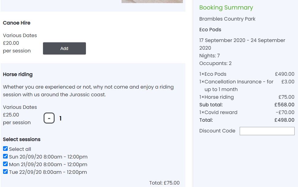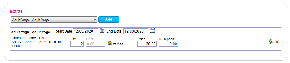 You can select the start date if the event runs over multiple sessions throughout the booking and you can book as many people as you like on the event. It will then price the event in the same way as a normal extra with the green refresh and this will then book the spots onto the event.