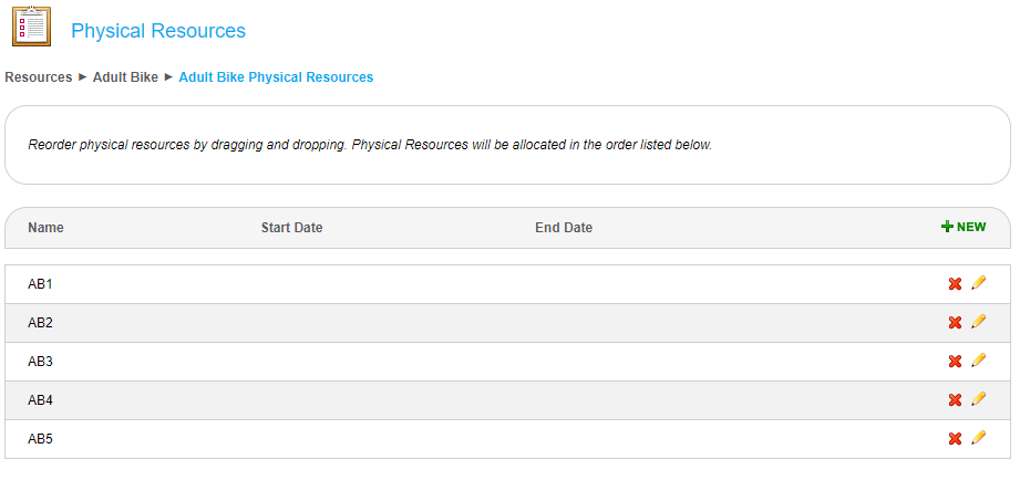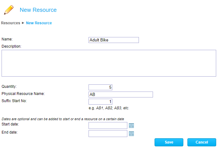 The new resource screen will create the resource definition and the initial number of physical resources. So below will create a resource of Adult Bike with 5 bikes called AB1 to AB5. The start and end date are optional and can specify the date these resources will come into or go out of existence.