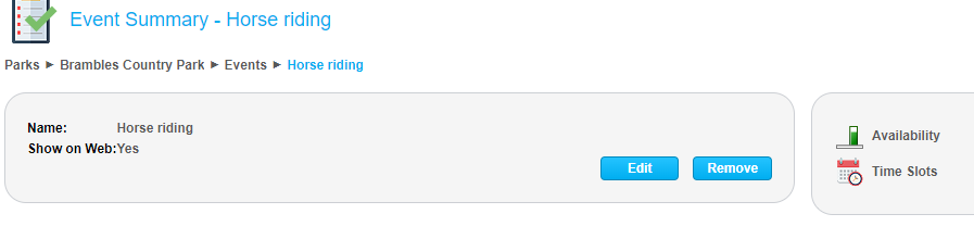 Events: Events are essentially a group of times slots which are linked to extras to sell. They define the dates and times of the timeslots available for the extra. The timeslots can also have a limited number of spaces which will work in conjunction with the resources limits when working out the availability of the extra.