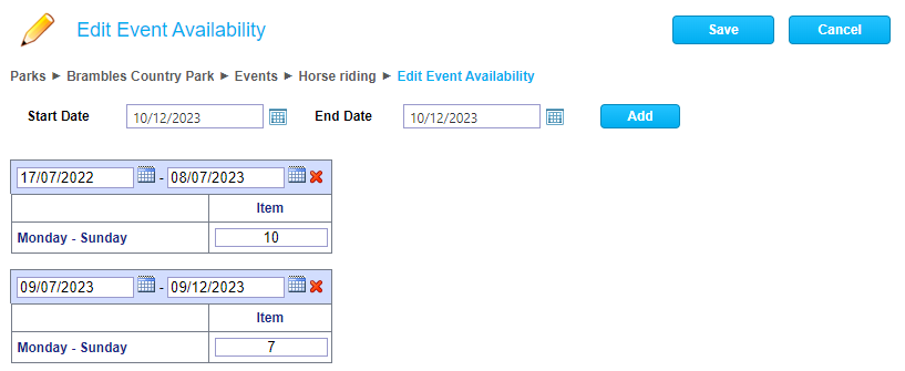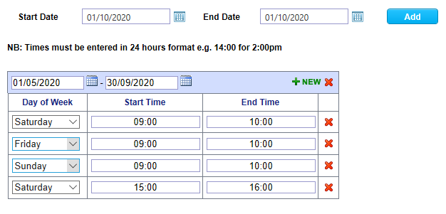 Availability can be set for different date ranges and applies to all timeslots falling on those dates.