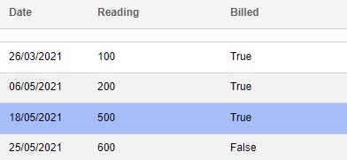 This page will now show you all meter readings for that meter, displaying the date, reading and whether the meter has been billed.