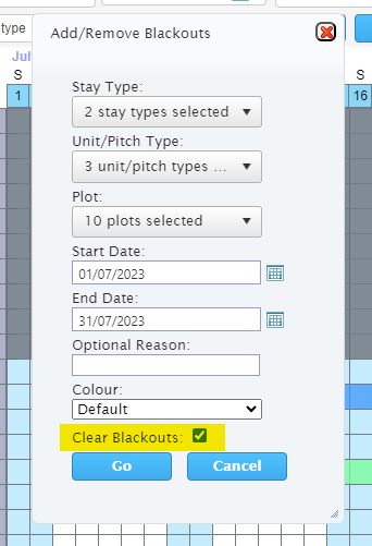 To remove a bulk blackout you run the pop out in the same way as you add them, by selecting the plots, start and end date.
