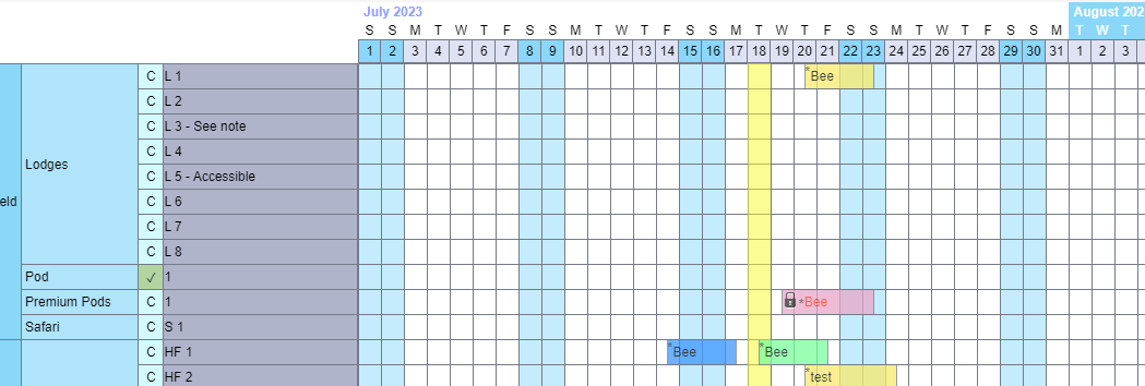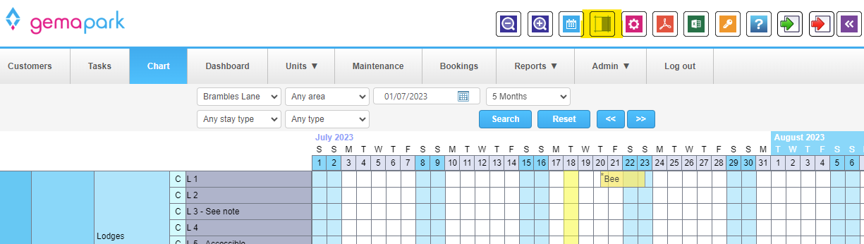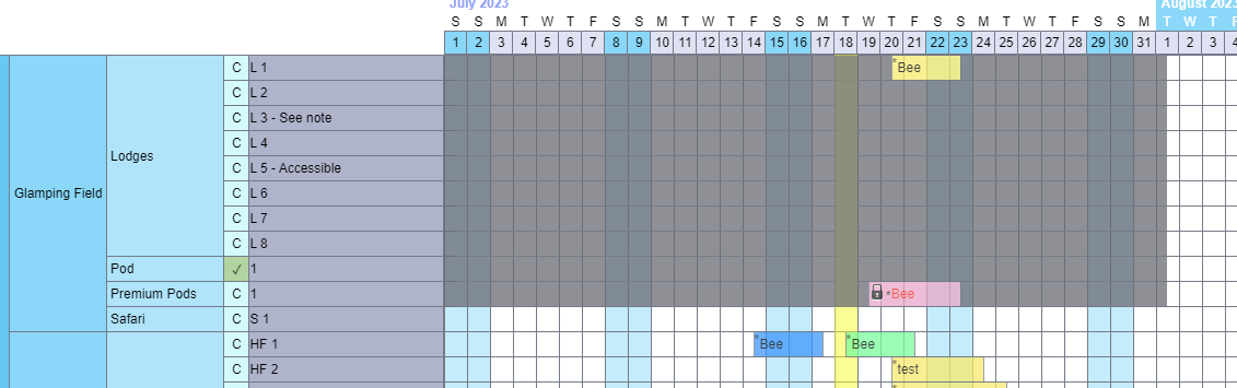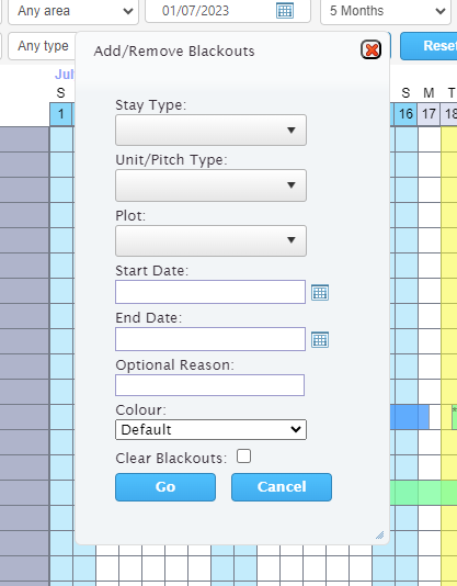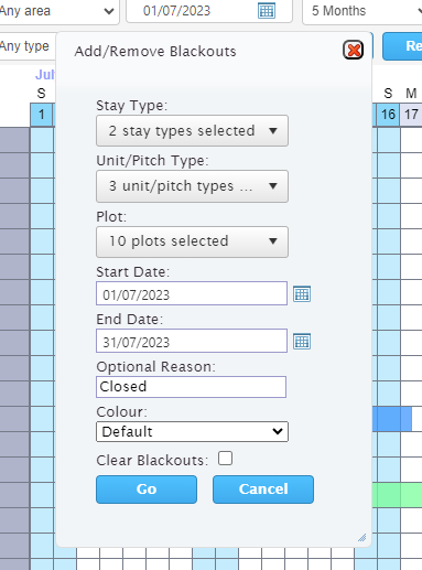 Blackout dates are unbookable dates and can be added and removed from single units and pitches via the chart.