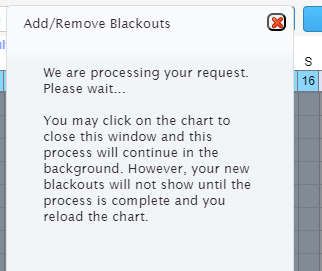 When you are happy with the configuration of the blackout wizard you can select go and the system will configure the blackouts and add them in. The system will tell you it is working on adding the blackouts: