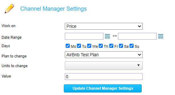 First you choose what you are working on: Price, Min Stay, Max Stay or Closure. Some channels do not listen to all these settings. If you have your channel (e.g. AirBnB) account open while you make these changes you should, with a short delay, see any changes that are reflected in the channel update.