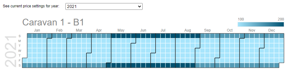 Here we are currently working on price. We have selected to see the prices for the year 2021. This is one of our units “Caravan 1 – B1”. There is a scale in the top right of each calendar. Be aware that for price this can change for each unit as it is set as the minimum price for that unit and the maximum price for that unit for the year. For this unit our prices range between 100 and 200 pounds. Just by using the calendar we can quickly see we have the low price all year Monday to Friday. Then on Saturday and Sunday we have a high price which is even higher between May and August. If we want to check what that exact values are, we can hover over the cell:
