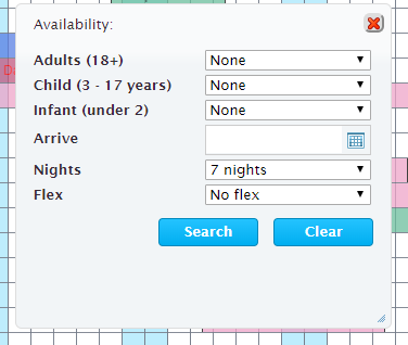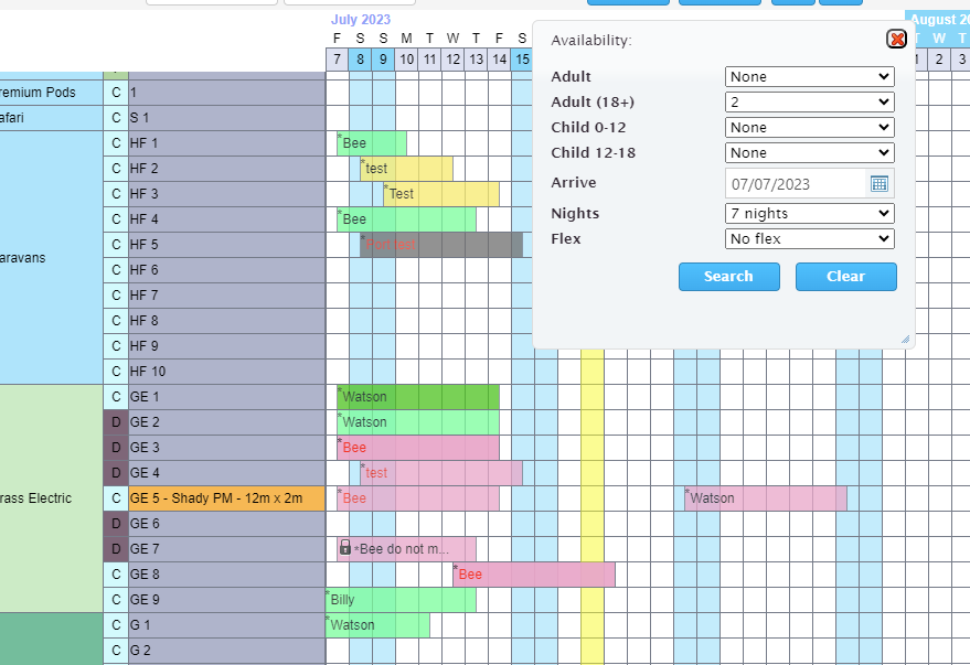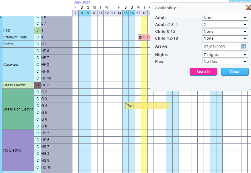 Pressing ‘Clear’ on the pop up will remove the availability filter and will set the chart back with all units shown. It will also clear the create booking priced based on the number of occupants back to the original level.