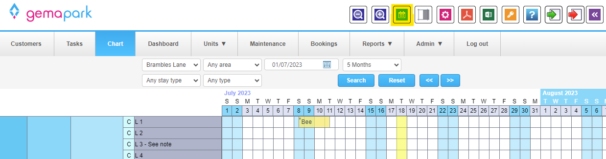 On the chart there is an availability search that allows you to filter the chart to only show available units on your search. This is particularly handy when customers call and you need to quickly find out what plots are available for certain dates.