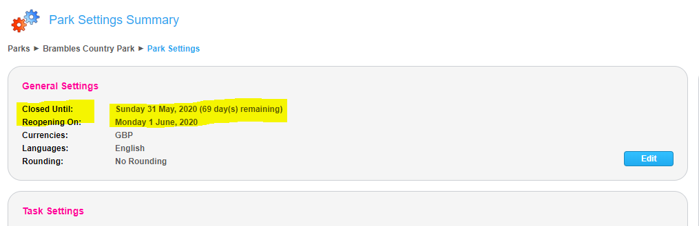 You will now see Closed Until and Reopening On dates visible in the Park Settings screen.