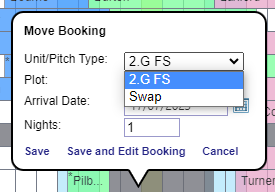 Swap pitches enable you to move one booking to make a space, move the new booking in to this space and then move your first booking to where the second booking was. When you are fully booked it is likely that you will only see the option for a swap pitch: