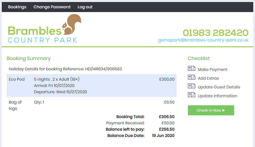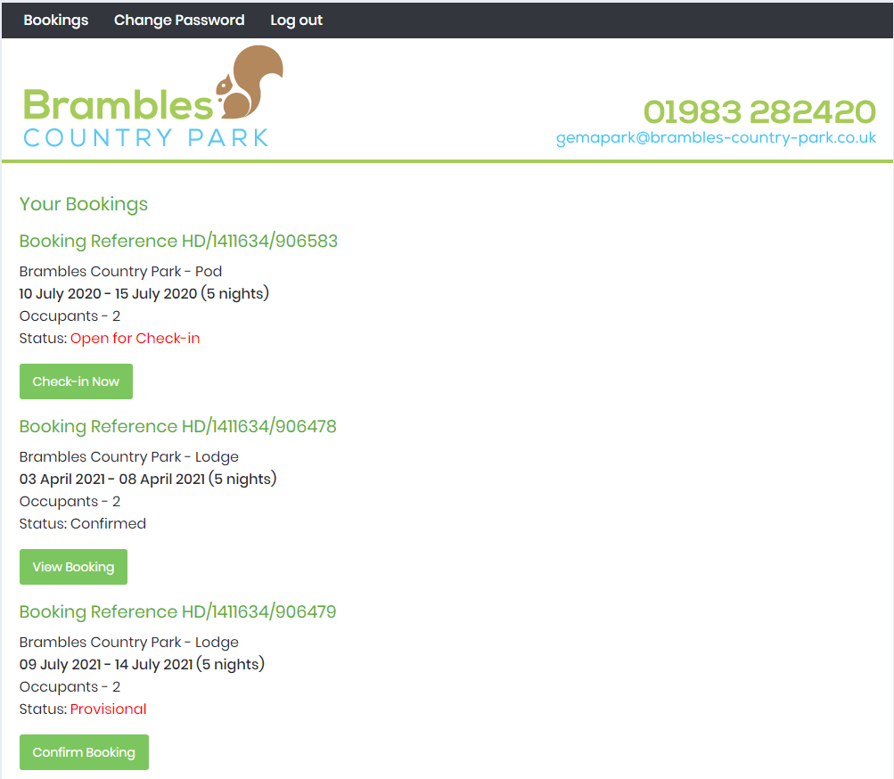 Your check-in is complete. Welcome to Brambles Holiday Park we hope you enjoy your stay.