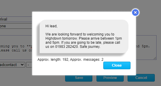 This will substitute the booking fields for test data and estimate the size of the message. (a long message may be sent as two message and therefore take two credits even though most modern phones will show it as one message.)