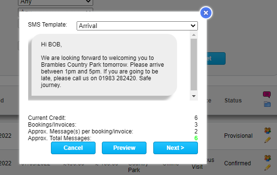 This screen also shows you your current credits, how many of the bookings you have selected are contactable by Text*, and How many messages i.e. credits are estimated to be used. This is an estimate because if you message is near the limit of one message a person with a long name may require 2 credits where as a person with a short name would only require one.