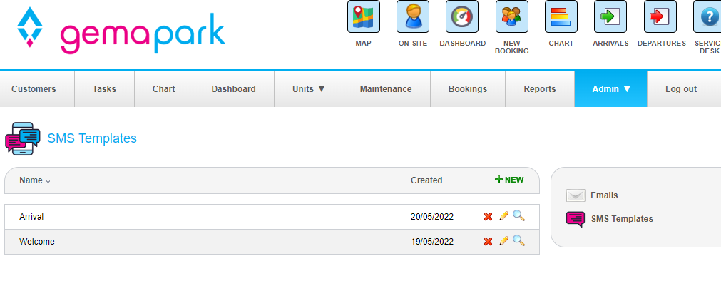 Selecting Admin > Emails / SMS Templates and then SMS Templates from the left side menu will take you to the screen below.